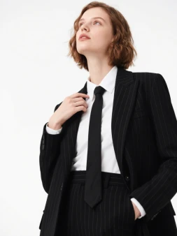 Elegant black pinstripe suit with structured blazer and high-waist pants, perfect for professional settings.
